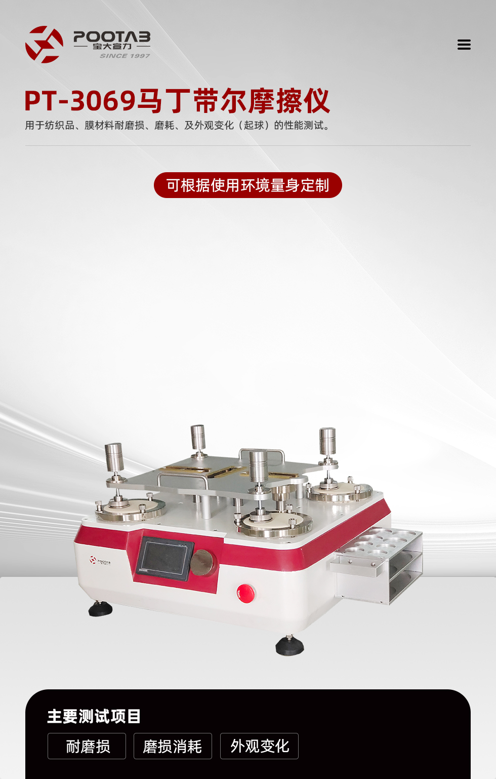 一種耐磨試驗(yàn)機(jī),用于測(cè)試紡織品、膜材料的耐磨損、磨耗及外觀變化(起球)的性能。