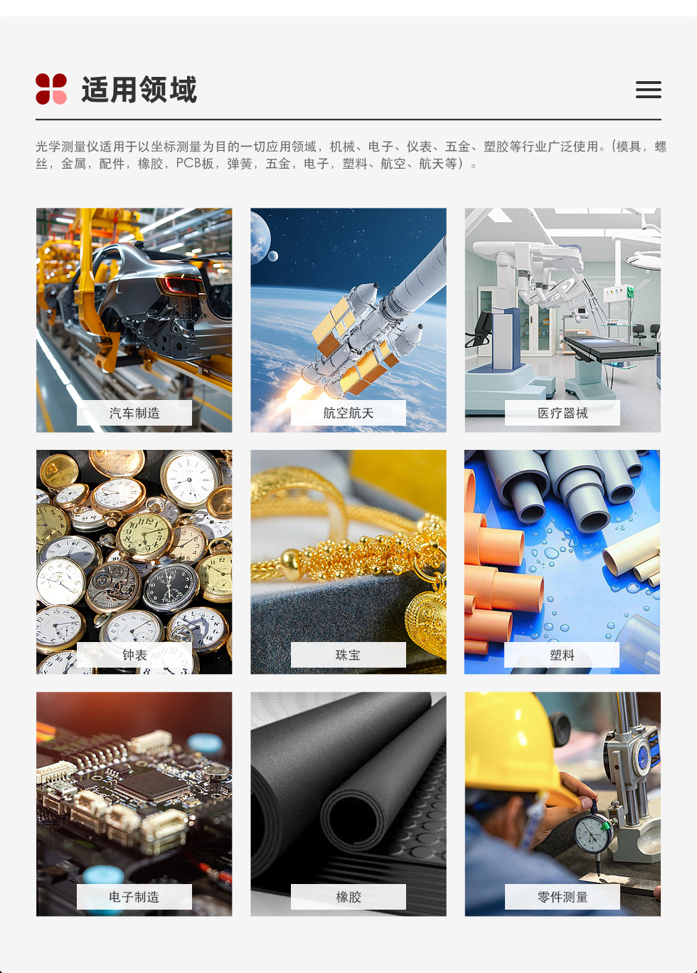 影像測(cè)量?jī)x,又名光學(xué)測(cè)量?jī)x與非接觸式測(cè)量?jī)x、二次元測(cè)量?jī)x、2.5次元測(cè)量?jī)x,伴隨現(xiàn)代工業(yè)高精度、微制造產(chǎn)業(yè)的升級(jí),非接觸方式成為大勢(shì)所趨。突破傳統(tǒng),采用非接觸式光學(xué)影像測(cè)量方式進(jìn)行快速精密的幾何尺寸和形位公差的測(cè)量,成為必然。因其在微型精密測(cè)量領(lǐng)域的強(qiáng)大用途,已為越來(lái)越多的主流應(yīng)用領(lǐng)域接受的快速尺寸測(cè)量方式。光學(xué)測(cè)量?jī)x適用于以坐標(biāo)測(cè)量為目的一切應(yīng)用領(lǐng)域,機(jī)械、電子、儀表、五金、塑膠等行業(yè)廣泛使用。(模具,螺絲,金屬,配件,橡膠,PCB板,彈簧,五金,電子,塑料、航空、航天等)它克服了傳統(tǒng)游標(biāo)卡尺,千分尺,和投影儀的不足,是集光學(xué)、機(jī)械、電子、計(jì)算機(jī)圖像處理技術(shù)于一體的高精度、高可靠性的測(cè)量?jī)x器。由光學(xué)放大系統(tǒng)對(duì)被測(cè)物體進(jìn)行放大,經(jīng)過(guò)CCD攝像系統(tǒng)采集影像特征并送入計(jì)算機(jī)后,可檢測(cè)各種復(fù)雜精密零部件的輪廓和表面形狀尺寸、角度及位置,全自動(dòng)地進(jìn)行微觀檢測(cè)與質(zhì)量控制??蓪y(cè)量數(shù)據(jù)導(dǎo)入AUTOCAD中,成為完整的工程圖,生成DXF,IGS等格式的文檔,也可輸入到WORD、EXCEL及SPC統(tǒng)計(jì)分析軟件中,生成CPK及各種統(tǒng)計(jì)報(bào)表。